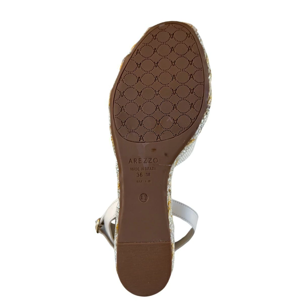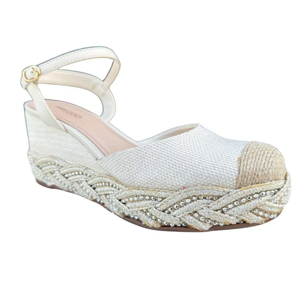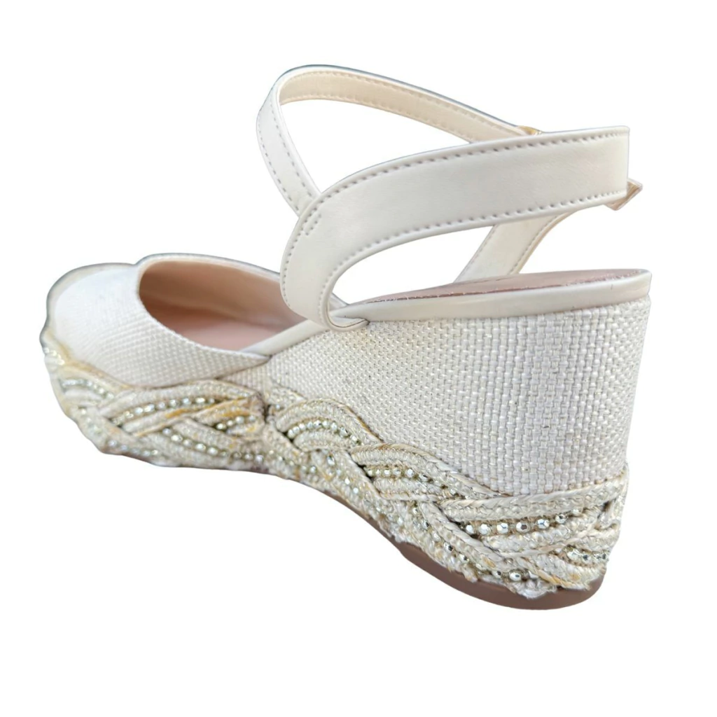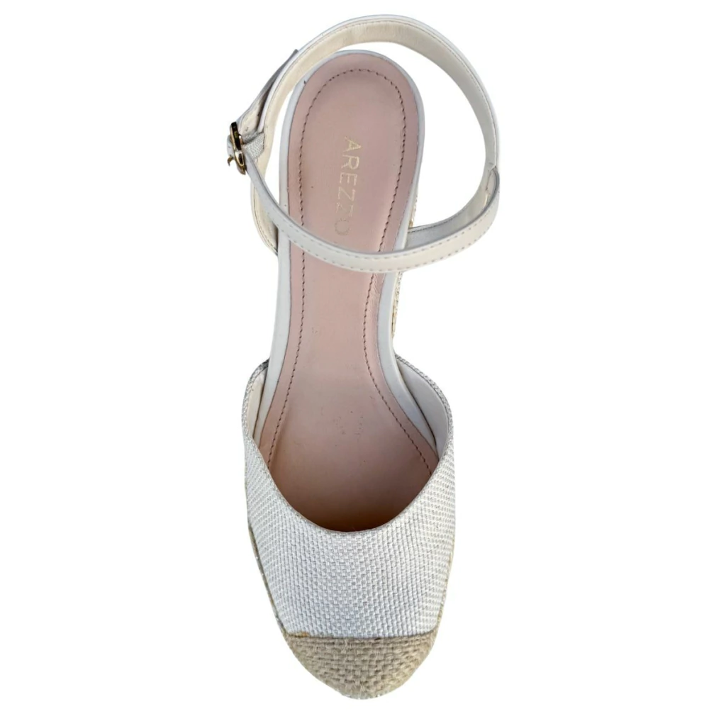 Espadrille Off-white, bege. O modelo tem salto médio anabela revestido em tecido tramado, base flatform com cordões trançados e detalhes em strass e bico redondo revestido em corda natural. Ou seja, apresenta vários materiais. Traz cabedal em tecido cru tramado e tiras que contornam o calcanhar e o tornozelo, com detalhe em strass, fechando em fivela metálica lateral. Aberta atrás, deixa o calcanhar à mostra. A espadrille é garantia de looks despojados e confortáveis e insere uma pegada natural com o uso da corda. O detalhe em strass traz um toque glam ao modelo, que pode ser usado com vestidos, saias ou pantacourts para uma produção super charmosa.