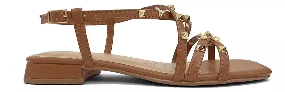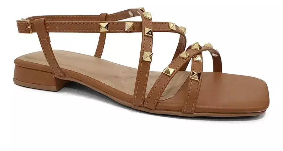 A Sandália Feminina Sua Cia tem o design com tiras finas com aplicação de tachas metálicas douradas, que adicionam um charme fashionista ao look sem abrir mão da leveza e praticidade.