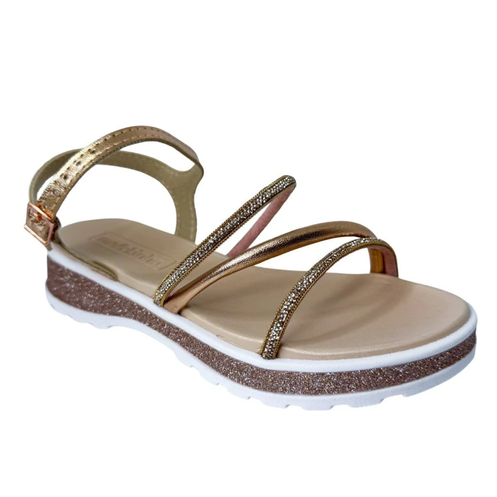 Com um solado flat alto de 3 cm e tratorado, ela oferece um suporte confortável e seguro para os pés em cada passo. As tiras delicadas com brilhantes não só adicionam um toque de glamour, mas também tornam essa sandália perfeita para diversas ocasiões, desde festas de aniversário até passeios no parque. O ajuste no tornozelo, feito por uma fivela, garante um encaixe seguro, permitindo que as meninas se movam com liberdade. O material sintético é leve e fácil de limpar, ideal para o uso diário.