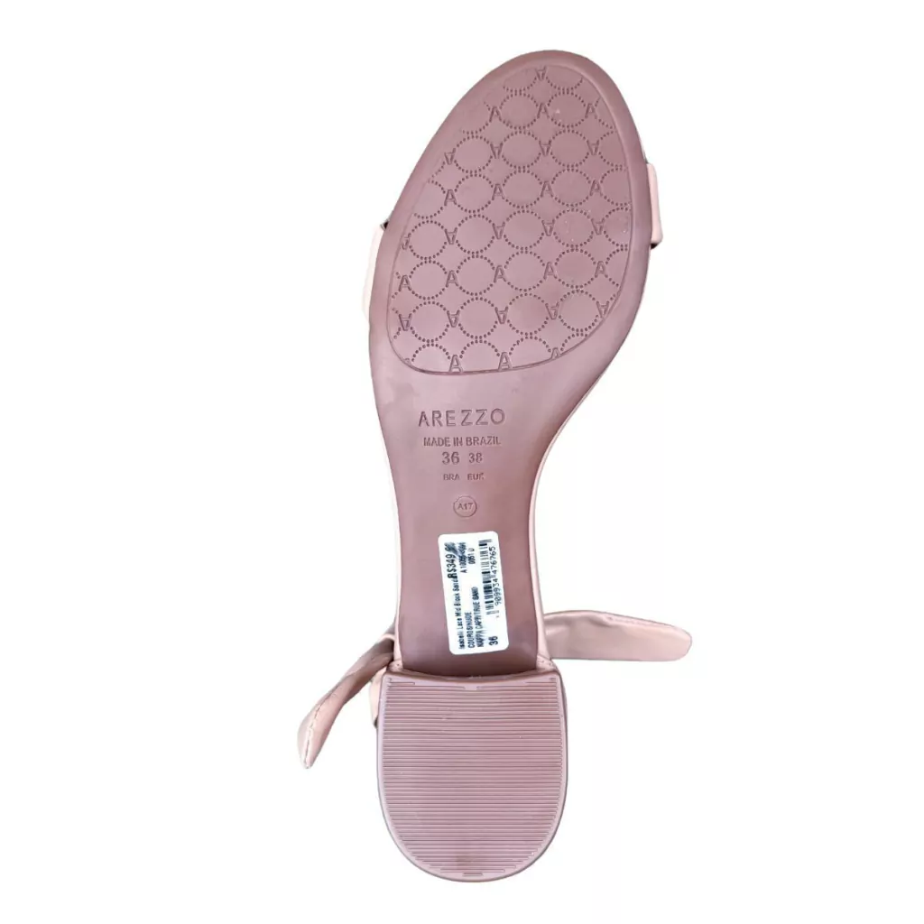 O modelo tem salto médio bloco, revestido em couro, e bico redondo. Traz tira média sobre os dedos. Coberta no calcanhar, possui tiras largas em torno do tornozelo, fechando em amarração frontal. Com palmilha bege e inscrição do nome da marca. A sandália exibe todo o peito do pé e os dedos.