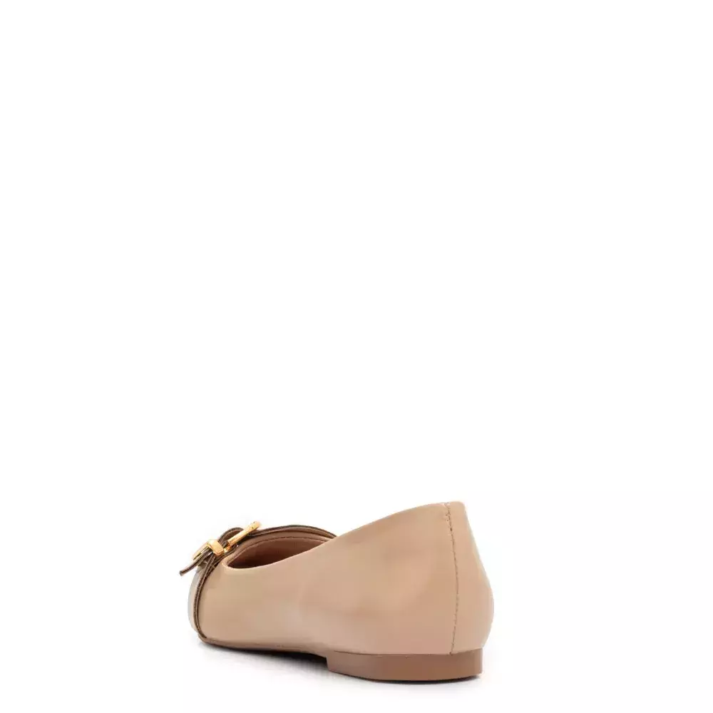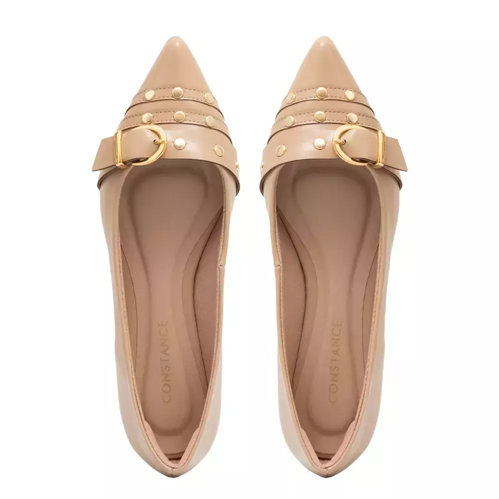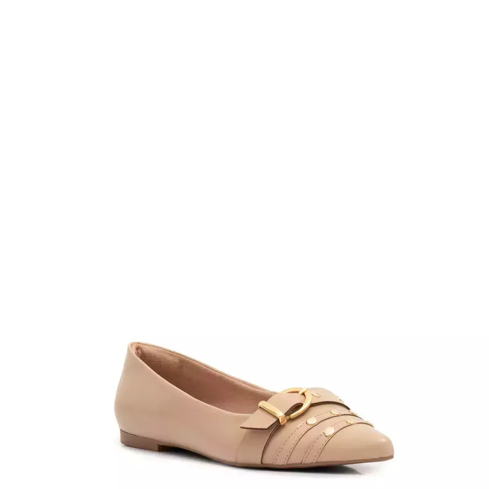 A Sapatilha Bege com Fivela e Tachas é a união perfeita entre elegância e personalidade. Com design atemporal, ela ganha destaque pelos detalhes em fivela metálica e tachas decorativas, que adicionam um ar moderno e ousado à peça.
