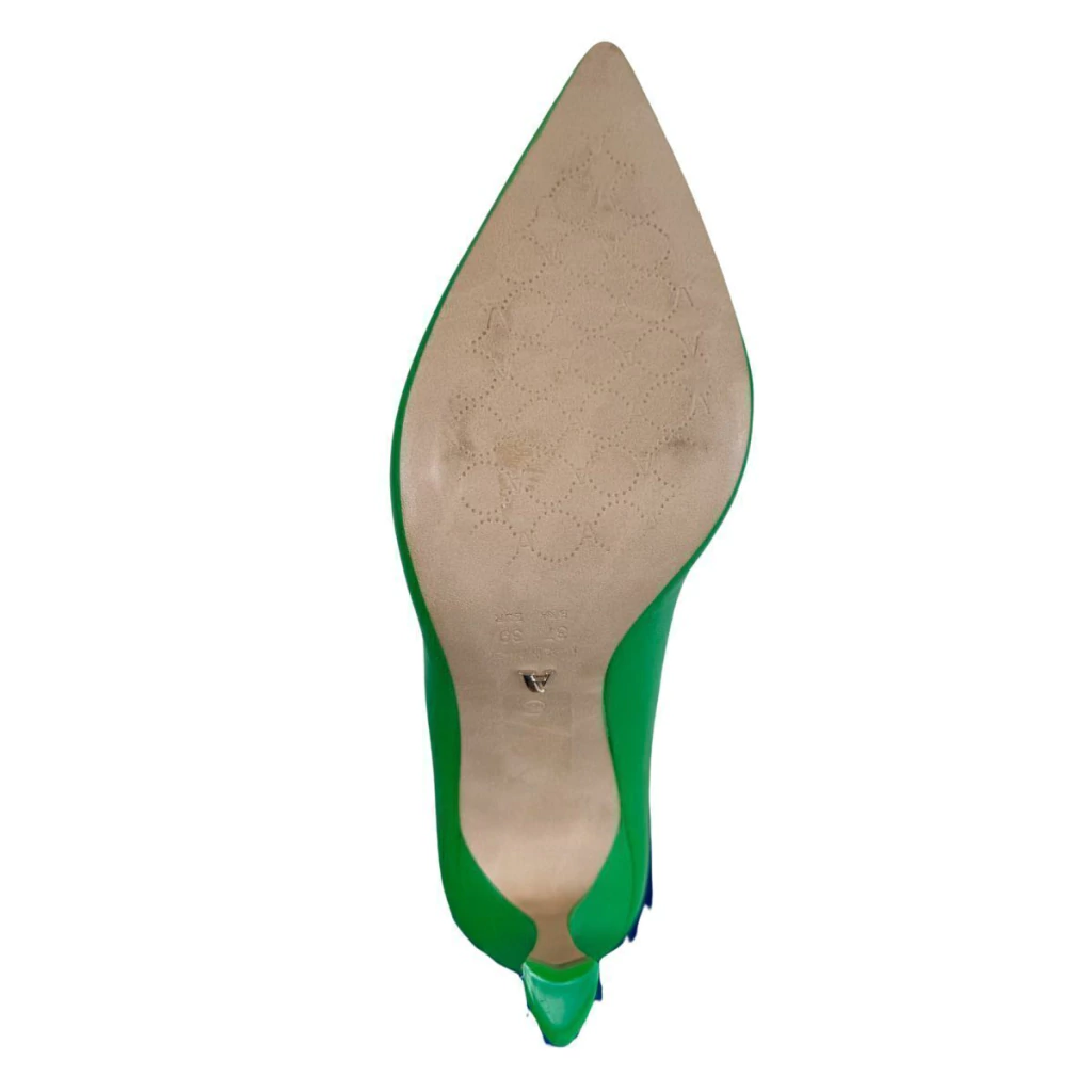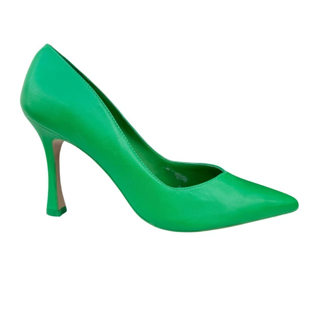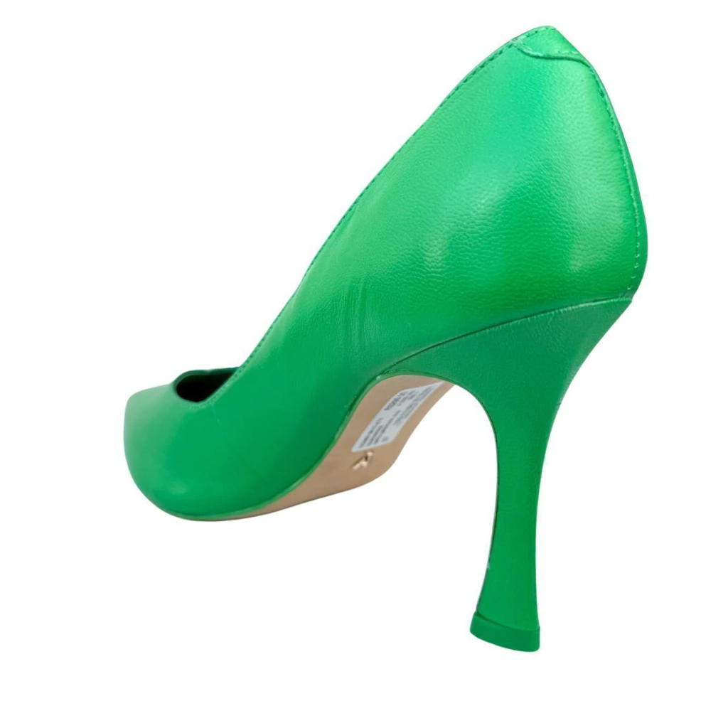 Scarpin verde de couro. O modelo tem salto alto fino, levemente alargado na base, e bico fino. Fechado, traz recorte em V sobre o peito do pé, formato ajustado nas laterais e palmilha da cor do calçado.