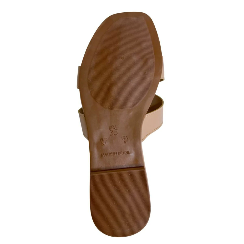 O tamanco rasteiro cor NUDE, preso só na parte frontal do pé, consegue ser chique e despretensioso ao mesmo tempo.